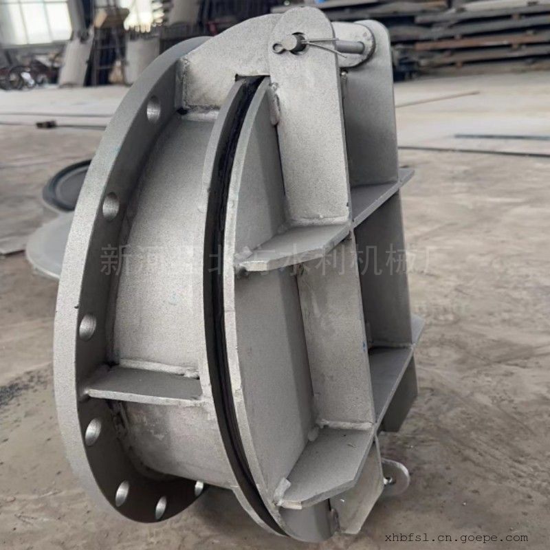 拍门结构与工作原理:由拍门座、拍门板等部分构成。拍门仅用于单向水流的圆形和方形出水口,结构严密,工作可靠,无需人力启闭力来自水源压力,当拍门内的水压大于拍门外侧压力则开启,反之则关闭。