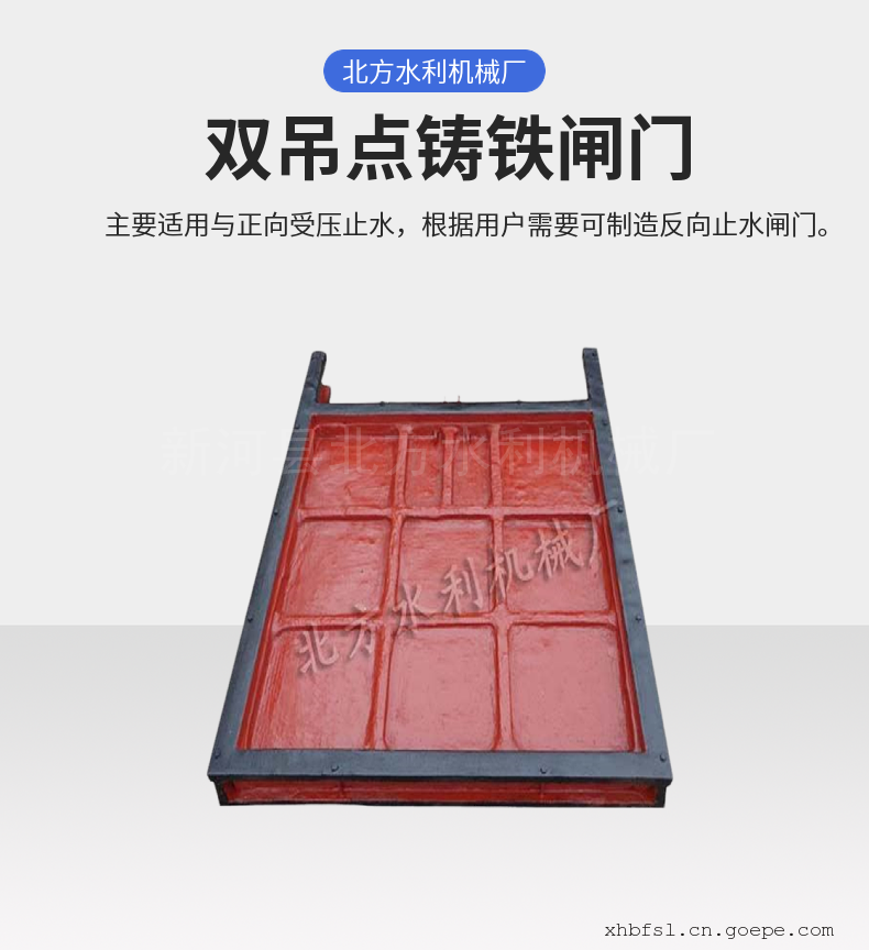 铸铁闸门主要适用与正向受压止水,根据用户需要可制造反向止水闸门。在结构上采用机加工硬止水,根据用户要求,可采用镶铜或镶不锈钢止水。双吊点铸铁闸门正常使用水头1-6米,还可承受一定的反向水头,为满足用户要求,可制造高水头闸门。 双吊点铸铁闸门安装用整体安装,二期浇注,将闸板与闸框的封水间隙调到0.3mm以下,方可进行二期浇注。在浇注混凝土时,流进闸板、闸框、斜铁、挡板间隙中的灰浆必须擦掉,防止灰浆凝固后影响闸门启闭。闸门上下框设有固定块,可防止闸板在运输吊装等过程中滑出,安装凝固后(使用前)应先卸掉上闸框的固定块和下框紧回螺栓,方可启动。闸门启闭时,应注意闸板的上下板限位置,以免陨坏闸门或启闭机。