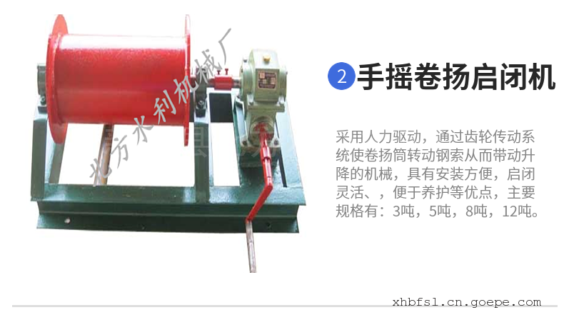 手电两用启闭机是一种多功能启闭机,广泛用于水利水电工程、河道治理工程、各类给排水工程及城市污水治理工程中的闸门、堰门等升降调节。手电两用启闭机结构由机壳、机盖、支架、螺母、螺杆、压力轴承、螺杆、蜗杆、蜗轮手摇柄、电机、电器等组成。手电两用启闭机采用蜗轮,蜗杆变速螺母旋转,使螺杆上下运动。手电两用启闭机具有扭矩保护和行程限位双重防护措施;有单台控制和集中控制等多种控制形式;手电两用启闭机有开度指示,有开闭灯光信号指示;有普通型、户外型、防爆型等多种形式,可适应各种不同环境的需要。