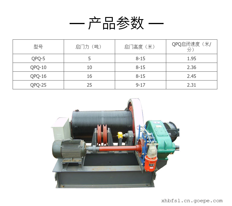 2、QPQ、QPK、QPG、QHQ型卷扬式启闭机系列,并有单吊点、双吊点和配有电驱动移动式、固定式。根据用户要求加手摇设置,产品吨位为:3-160T,可与平板、弧形闸门配套使用。