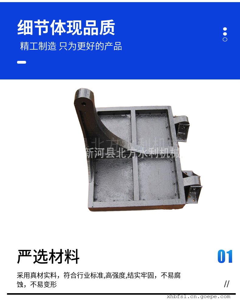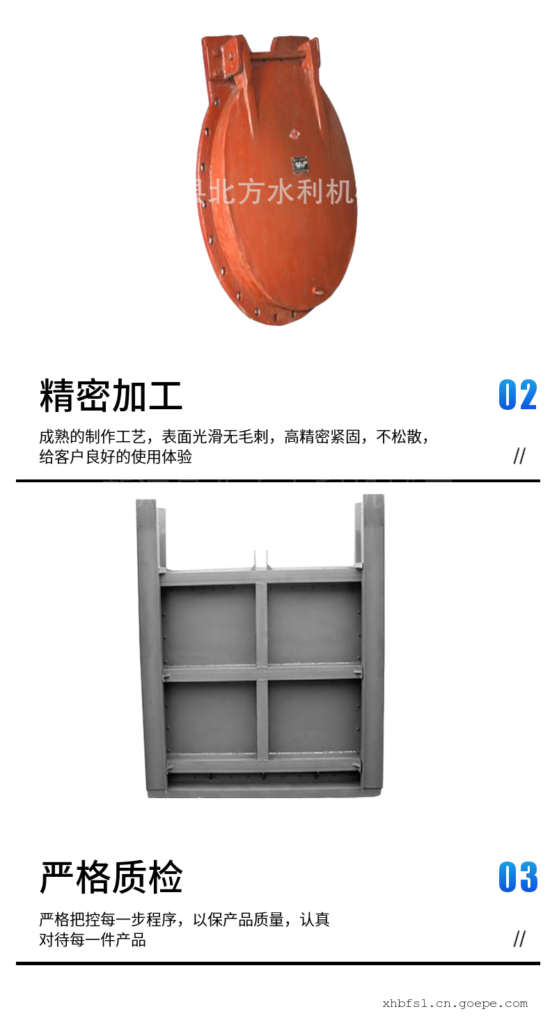 3、闸门系列:有钢结构闸门和铸铁闸门两种型号。钢结构闸门以钢板为基材、采用橡胶止水(可为闸门表面进行喷沙、喷防腐金属涂料)。产品可根据用户要求提供图纸生产。铸铁闸门:平面铸铁闸门、弧形铸铁闸门、高压铸铁闸门、双向止水铸铁闸门、镶铜铸铁闸门、机闸一体式铸铁闸门、门盖式铸铁闸门等多种规格型号,各式拍门、潮门。