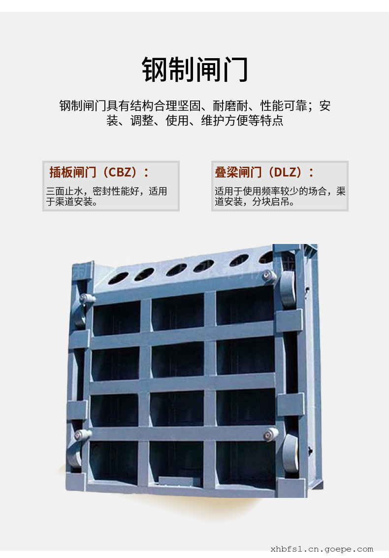 3、闸门系列:有钢结构闸门和铸铁闸门两种型号。钢结构闸门以钢板为基材、采用橡胶止水(可为闸门表面进行喷沙、喷防腐金属涂料)。产品可根据用户要求提供图纸生产。铸铁闸门:平面铸铁闸门、弧形铸铁闸门、高压铸铁闸门、双向止水铸铁闸门、镶铜铸铁闸门、机闸一体式铸铁闸门、门盖式铸铁闸门等多种规格型号,各式拍门、潮门。