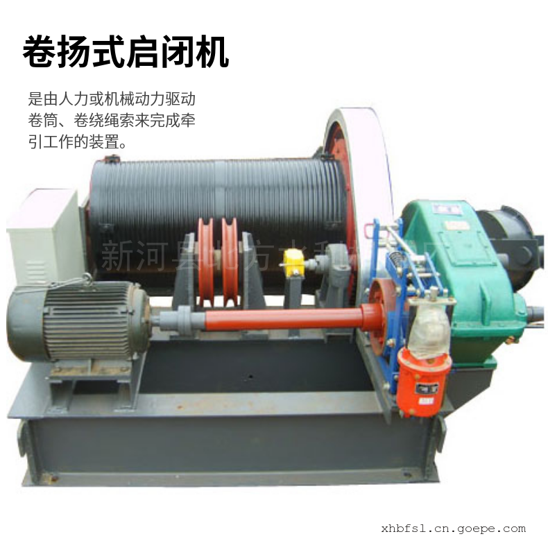 2、QPQ、QPK、QPG、QHQ型卷扬式启闭机系列,并有单吊点、双吊点和配有电驱动移动式、固定式。根据用户要求加手摇设置,产品吨位为:3-160T,可与平板、弧形闸门配套使用。