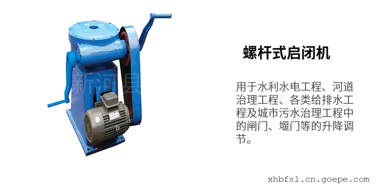 1. 螺杆式启闭机:通过旋转螺杆推动闸门升降,结构简单、安装方便、造价低,但启门力和行程有限,适用于小型水利工程。